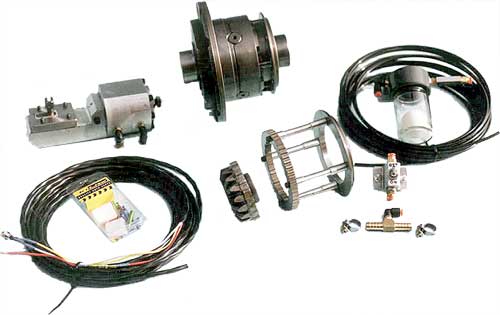 The Vacuum Operated 4 Pinion Gear Locking Differential Carrier (pictured), can be manufactured to fit most conventional automotive Differentials. Pictured below with the LOCKING CARRIER, is the LOCKING CARRIERS INTERNAL LOCKING RING and AXLE GEAR. The size of the Locking Ring makes this Diff Lock extremely STRONG in operation. The Diff Lock should preferably be operated while the vehicle is in motion. Road Speed is of no concern while operating the Diff Lock, so long as straight line driving is taking place - because the Carrier Locking Ring and Axle Gears are all rotating at the same synchronised speed to one another. The Diff Lock Kit is supplied with a Cabin Warning Light which is a "Light Emitting Diode" (L.E.D. System). The L.E.D. will change from Green to Red when the Differential Lock is Engaged, and Green when Disengaged, so that the operator will always be aware the Diff Lock is either Fully Engaged or Fully Disengaged. The Engine Vacuum or Alternator Vacuum Pump Supply is drawn through a Water Trap mounted under the bonnet. The Water Trap also acts as a Vacuum Reservoir because of a Non-Return Valve, a 5 Port Pneumatic Valve is used to operate the Diff Lock. The Differential's Alloy Actuator, causes the Carriers External Slip Ring to Engage the Internal Locking Ring over the Lockable Axle Gear. At each end of the Actuator there are Limit Stops, which cause the L.E.D. Warning Light to change colour. Currently this VACUUM DIFF LOCK is available for; With this Design there are no encumbrances on Axle Size usage, as our AXLES range in size from 1 1/4" to 1 1/2" in diameter. With our Range Rover Units we can supply either 24, 30 or 31 Splined Axles. Our Land Rover units (both Rover and Salisbury Diffs) can be supplied with 24, 30 & 31. The Salisbury Diff can have up to 35 Splined Axles which are 1 1/2" in Diameter. Air operated locking carrier units are also available as above, refer to Parts & Ordering for images of these units. If you are interested in this Differential Lock Design for your vehicle - please contact us.